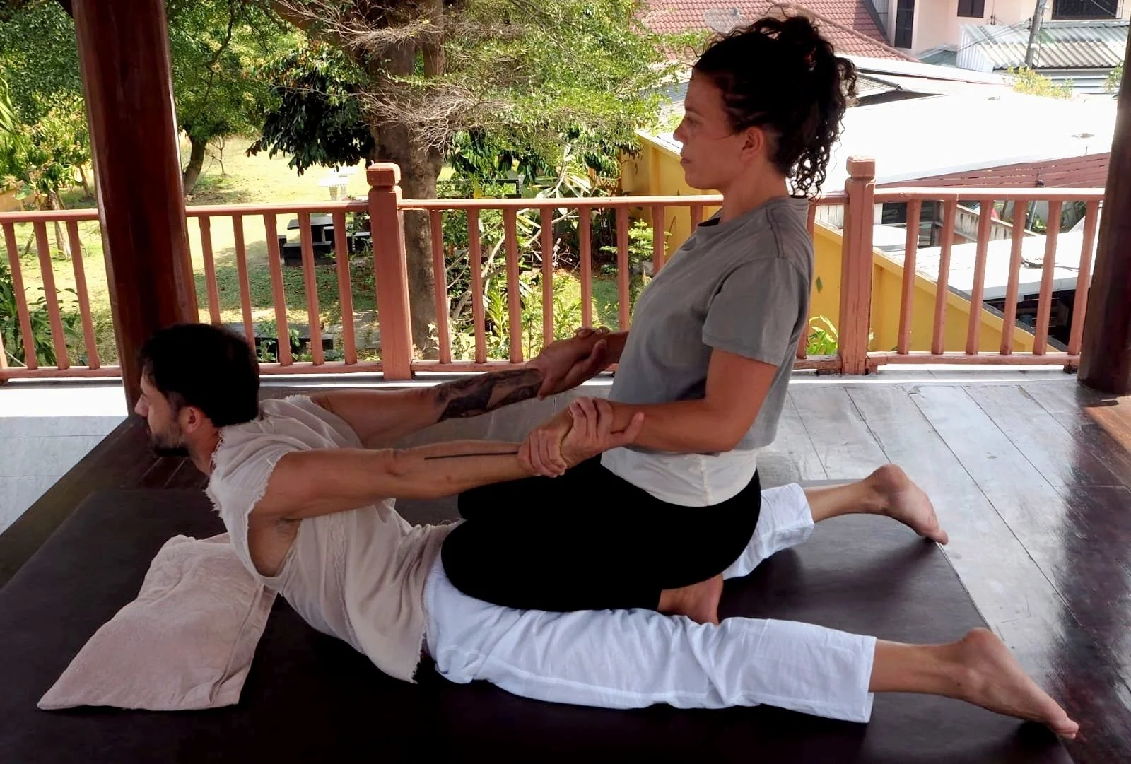 Sie ist ein wesentlicher Bestandteil der über 2500 Jahre alten traditionellen Thai Medizin. Sie besteht aus passiven vom Yoga abgeleiteten Dehnbewegungen, Gelenkmobilisation und Druckpunktmassagen. Zehn ausgewählte Energielinien die nach ayurvedischer Lehre den Körper als energetisches Netz durchziehen werden über sanfte Dehnungen und mit rythmischem Druck von Handballen, Daumen, Ellenbogen, Knie und Füssen durch die Massage bearbeitet.